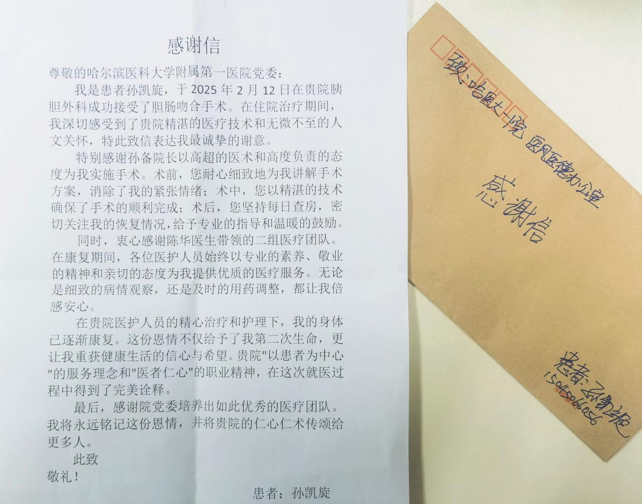 2025年4月,一封落款为“患者孙凯旋”的手写感谢信被郑重送至哈尔滨医科大学附属第一医院。信纸上,字里行间流淌着跨越生死的医患情谊,更记录着一场以技术为刃、以仁心为光的医学救援。
