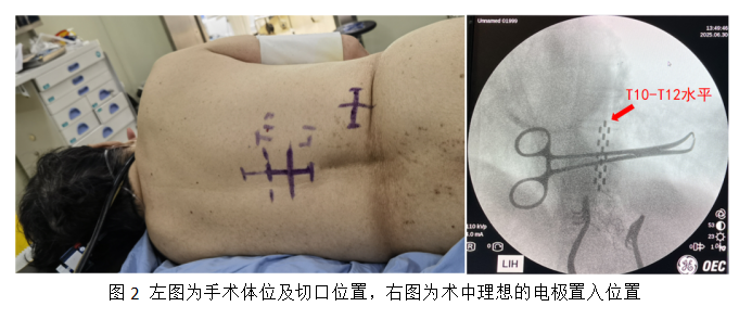 手术分为两次进行,首先在腰1-胸12椎体水平的椎管内置入电极,临时外接脉冲发生器,术后程控4日,观察疗效;效果满意的前提下,再进行二次手术,在体内置入脉冲发生器(图3所示)。由于患者89岁高龄,不但常年患有糖尿病,还伴有心脏疾病和慢性阻塞性肺气肿,这导致患者无法在全麻下进行手术。局麻手术,对患者及术者都是一种挑战!